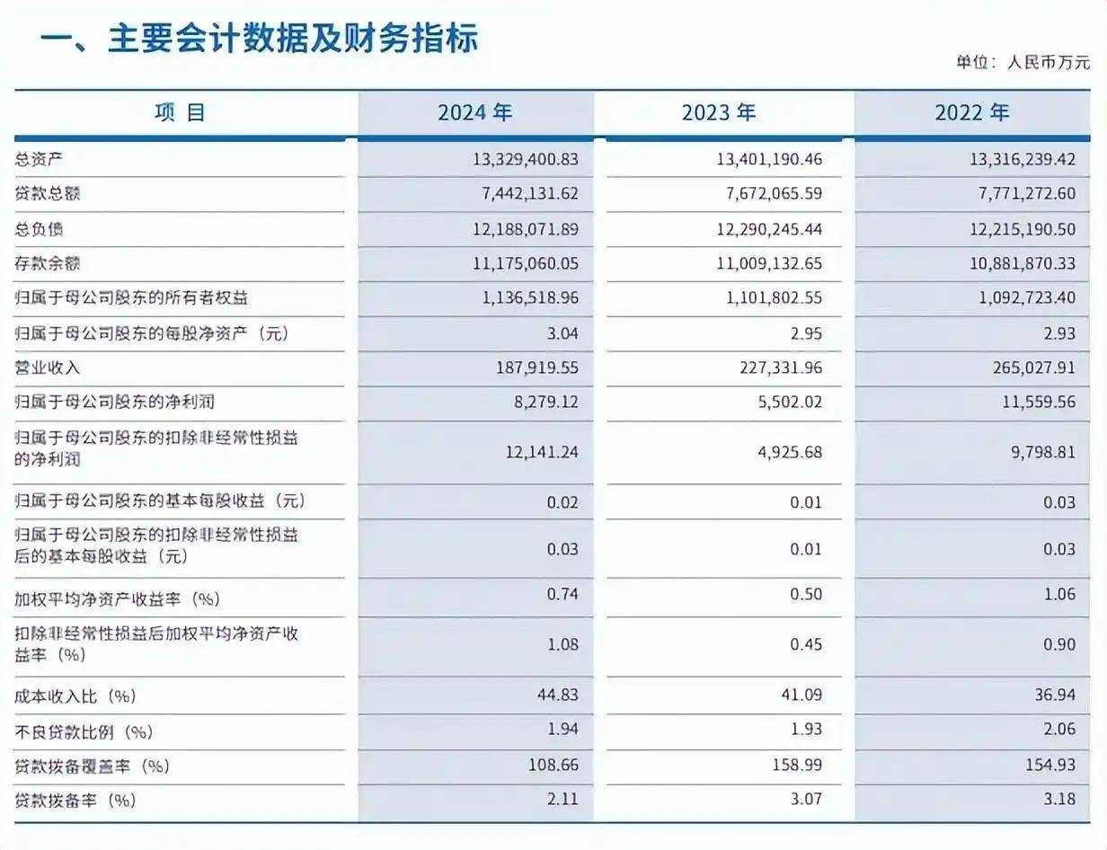 经营业绩上,该行的营收连续两年出现下滑。2022年,该行营收达到26.5亿元,2023年下降14.22%到22.73亿元。2024年,该行营收再次下降,为18.79亿元,下降幅度17.34%。
