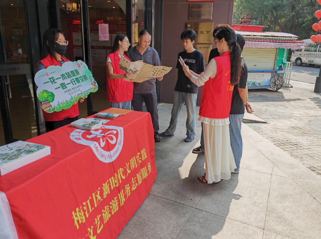 国庆期间,市文明办通过微信视频号发布文明旅游宣传海报,倡导广大市民游客文明出游,爱护生态环境和公共设施,自觉遵守公共秩序,做文明风尚的传播者。市文化广电旅游局、梅江区文明办、梅江区文化广电旅游体育局联合客天下景区共同开展假期文明旅游志愿服务活动,志愿者向过往市民游客发放《梅江八景宣传手册》等文明旅游宣传资料,并介绍文明旅游知识,号召广大市民游客增强文明出游意识,提升文明旅游素质。作为市文旅志愿者总队,市文化馆开展“群星大舞台”群众文艺展演文明旅游志愿服务活动,志愿者通过手势指引、口头播报、清理垃圾等方式,引导市民游客文明参加活动,使用文明语言,谦让长者、照顾妇女和儿童,提升文明旅游素质,做文明旅游的践行者。
